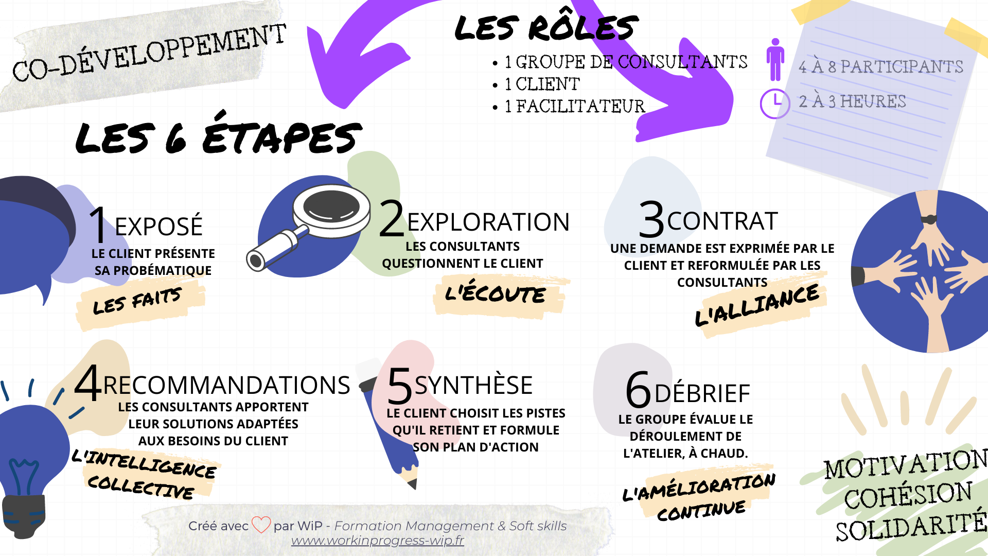 Comme son nom l’indique, l’atelier de “co-développement” consiste à prendre un temps en groupe, pour s’entraider les uns les autres, et progresser, ensemble.